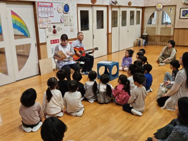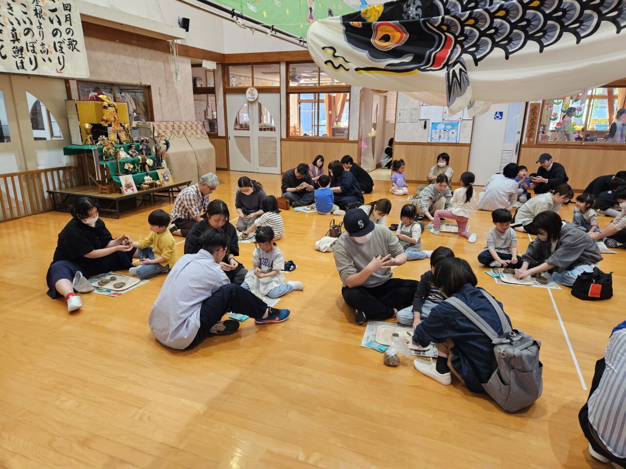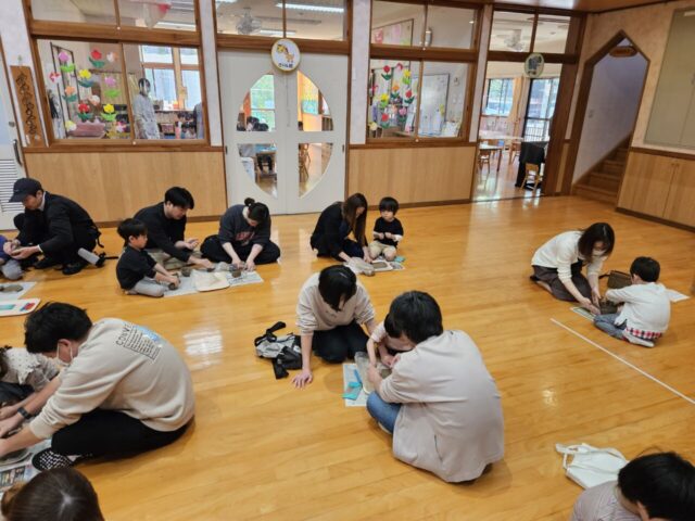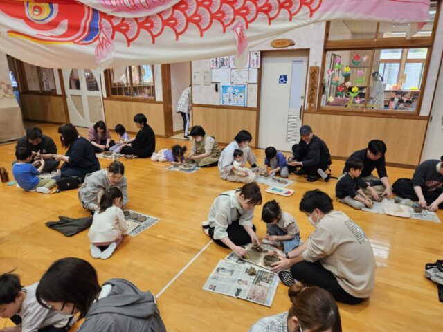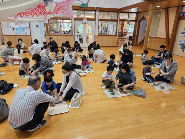 今日は、年長児ぞう組さんの保育参観が行われました。朝のお当番活動や漢字あそびの様子を見てもらった後、お遊戯室で『親子で焼きもの作り』を体験しました。講師に”ネンド(音&土)工房”の高橋さんをお招きし、色々アドバイスをもらいながら好きな物を自由に作りました。いざ作り始めると、思うように形にならなかったり、意外と大人の方が夢中になったり…会話を楽しみながら作る姿や、無になって静かーに作る姿も見られました。最後に髙橋さんのギター演奏に合わせて、歌ったり絵本の読み聞かせをしたりと盛りだくさんでした。完成した焼き物は、12月12日(土)の『ほたる展』に展示する予定です。どんな風に焼きあがってくるか楽しみですね♪ 年長さんになった子ども達の成長も楽しみにしています!