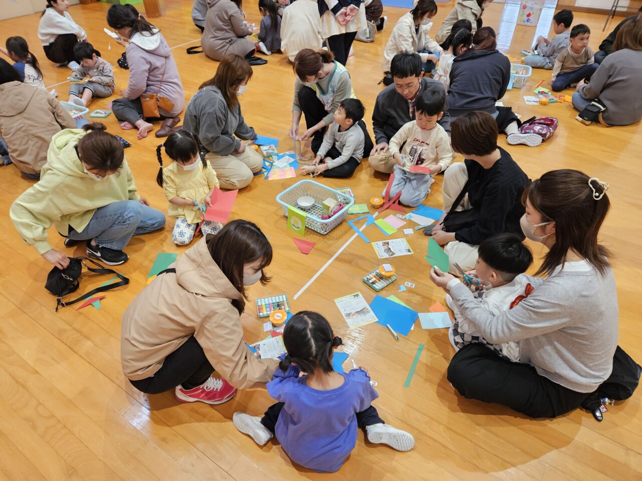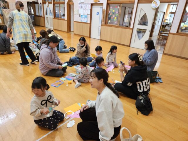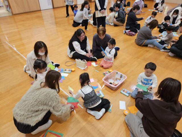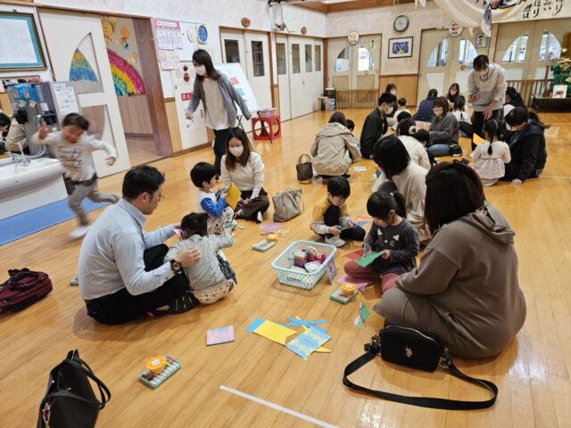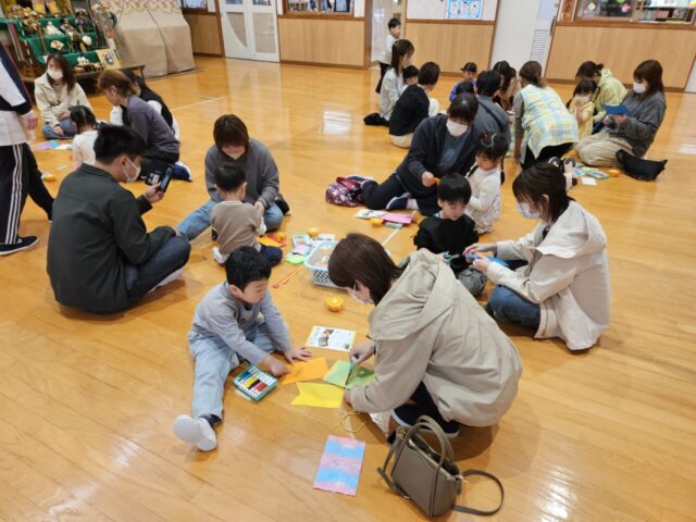 今日は、年中児きりん組さんの保育参観が行われました。朝のお当番さんの自己紹介では、たくさんのお家の方を前にちょっぴり恥ずかしそうにしていましたが、にこにこうれしそうな子ども達…。漢字あそびでは、最後クイズに挑戦し、正解すると大盛り上がりでした。その後、お遊戯室に出て親子で『吊るしこいのぼりづくり』を楽しみました。事前に染めた染紙でこいのぼりのからだの模様を自由にデザインしたのですが、細かい模様を好むお子さんもいれば、大きく大胆な模様を好むお子さんもいて、個性豊かなこいのぼりが完成しました✨完成したこいのぼりは、お部屋に飾ってもらい、ユラユラ揺れると「わぁーかわいい~❤」「ステキだねー」などの声が聞こえました。はさみの使い方やのりの塗り方なども上手になって成長を感じられました。きりん組での1年間の成長が楽しみです!